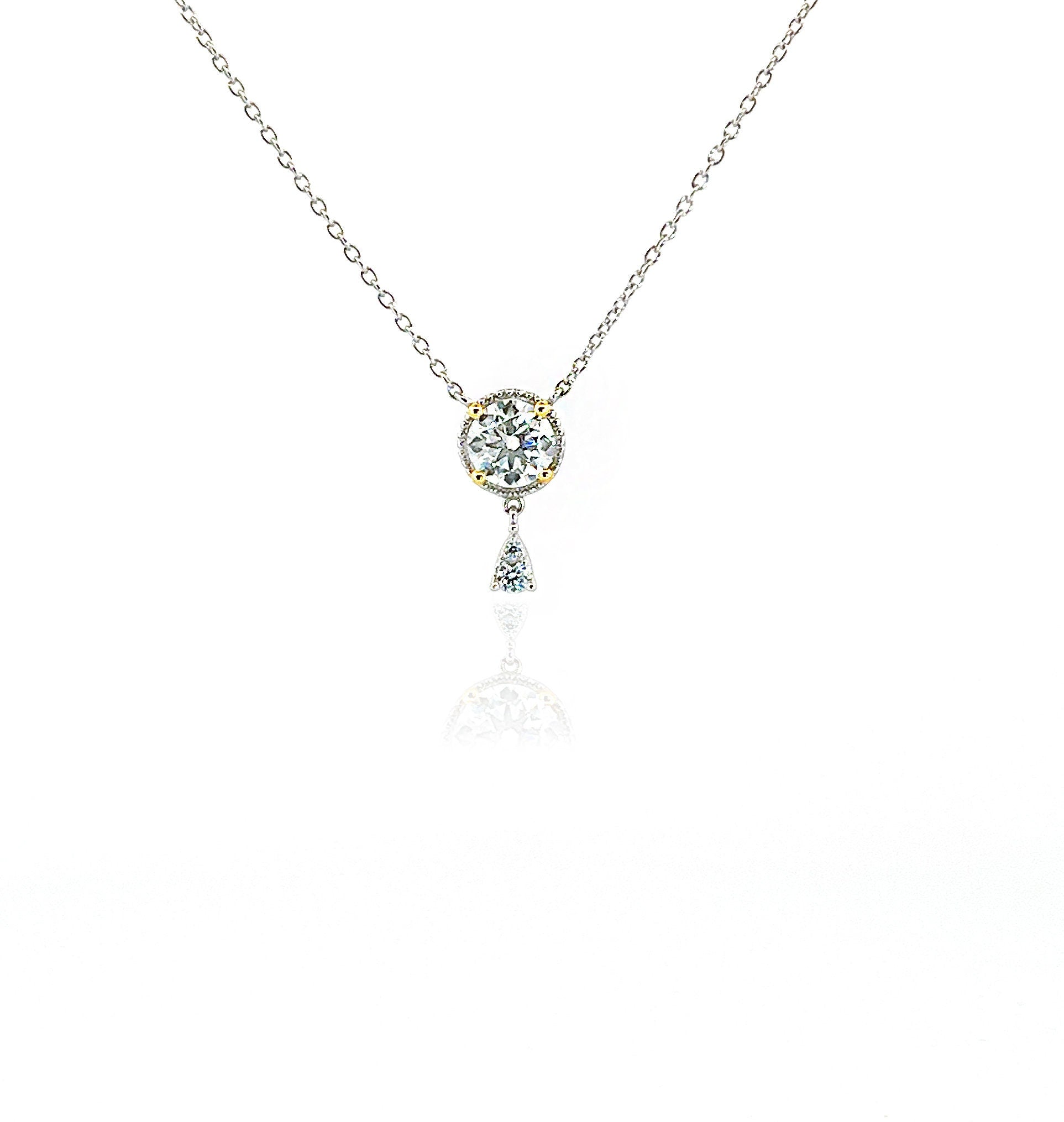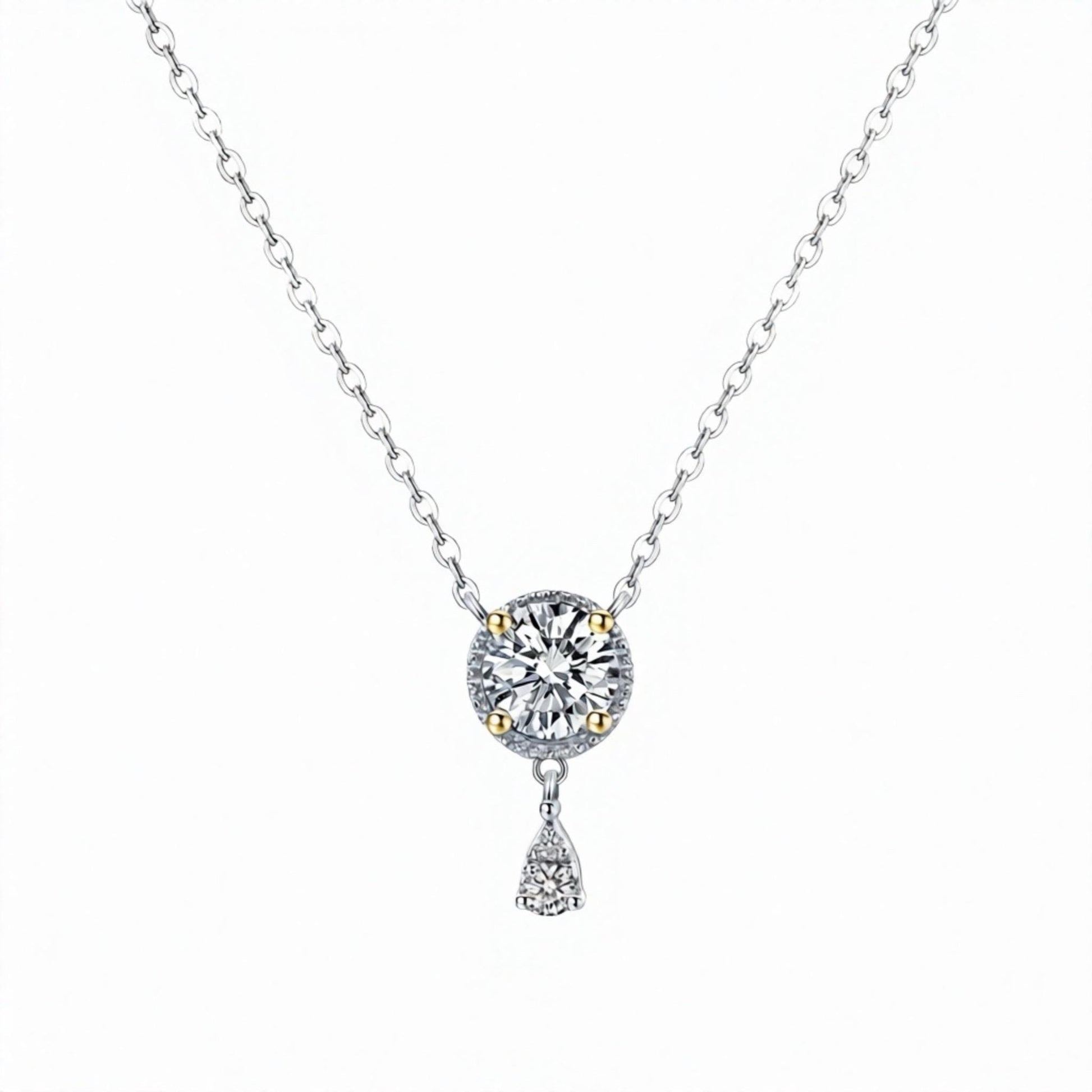 Introducing our exquisite 1.0Ct Certified VVS1 Moissanite Necklace, a true masterpiece in Rhodium and Yellow Gold Plated Sterling Silver. Elevate your style with this stunning Stimulated Diamond Dangling Necklace, designed to captivate hearts and turn heads.