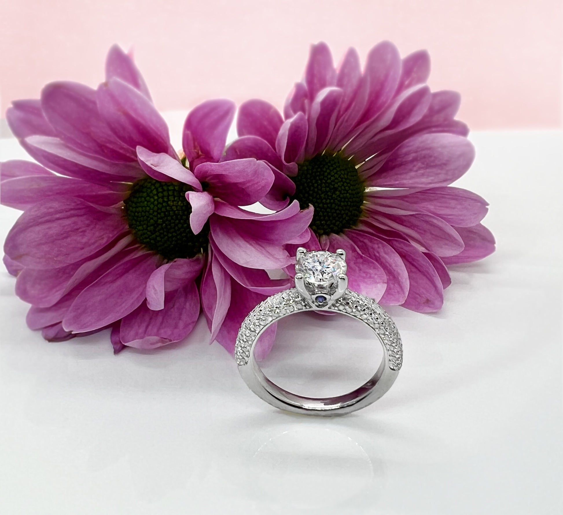 This moissanite engagement ring features a 1 ct VVS1-rated center stone, which means it has a very high level of clarity and is virtually flawless to the naked eye. The stone is set in a secure prong setting and is surrounded by a stunning pavé band that adds extra sparkle and glamour to the ring. The band itself is made from rhodium-plated sterling silver, which gives it a bright and shiny appearance while also offering durability and resistance to tarnishing.