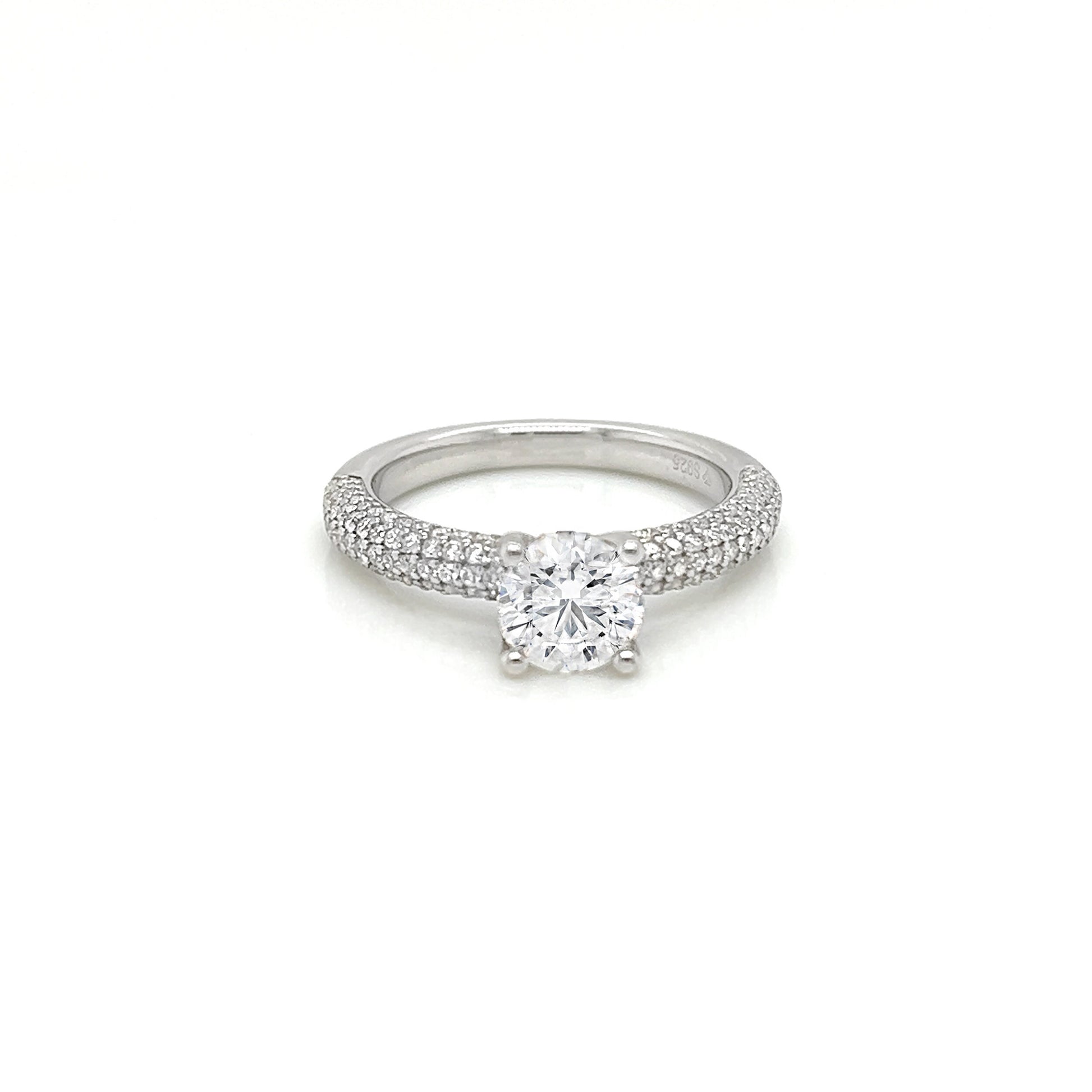 1 Ct VVS1 Moissanite Engagement Ring: Rhodium Plated Sterling Silver Pavé Band