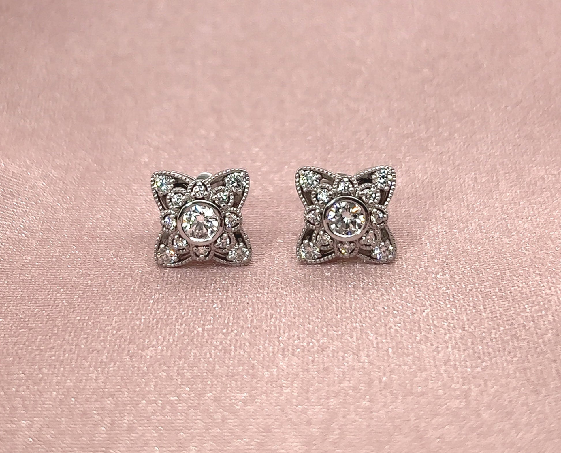 14K White Gold Diamond Stud Earrings: Flower Halo, VS1-H, 0.50 TCW