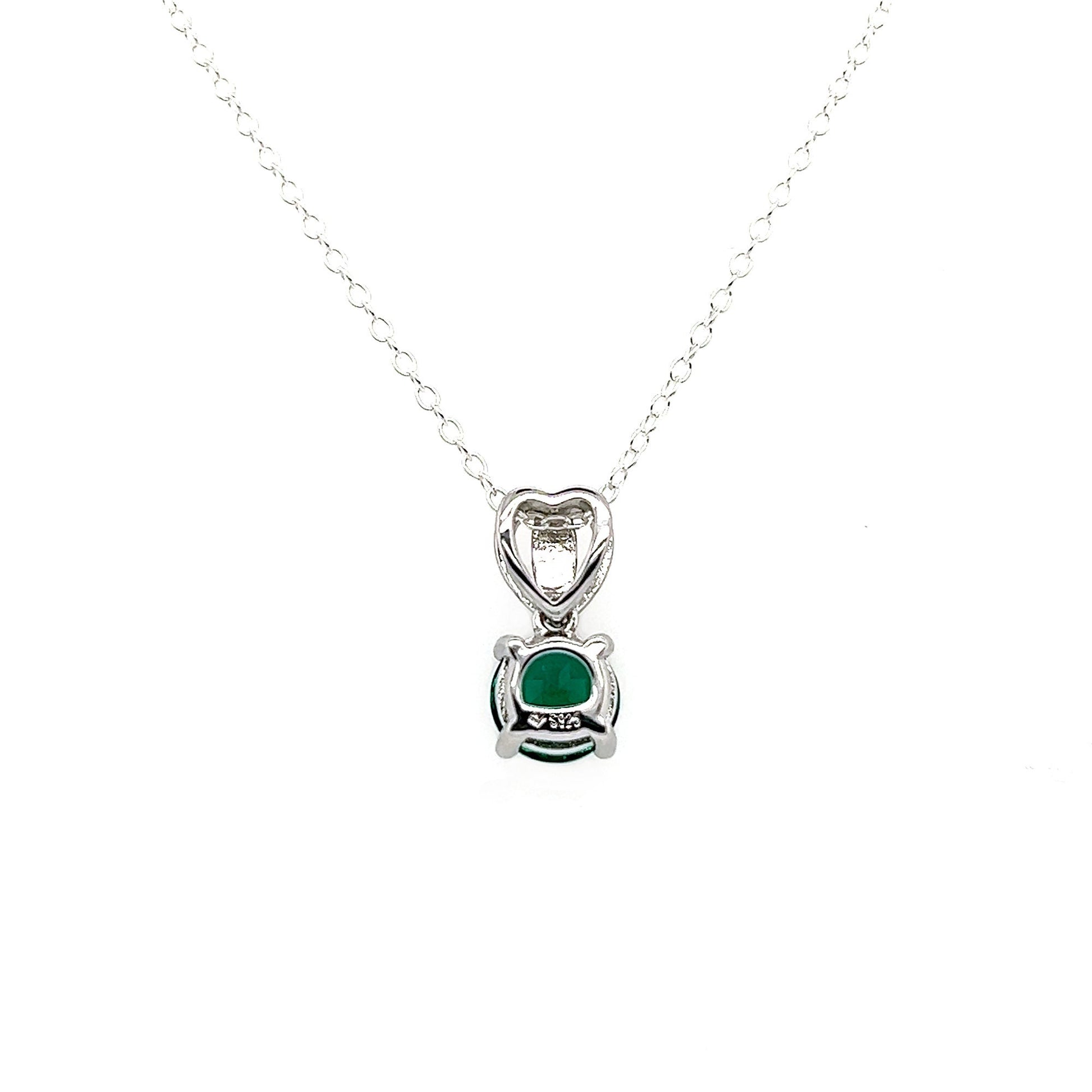 This necklace would make a stunning gift for a loved one or a beautiful addition to any jewelry collection. The combination of the rhodium-plated sterling silver and the classic round-cut emerald create a timeless and elegant look that can be worn for any occasion.