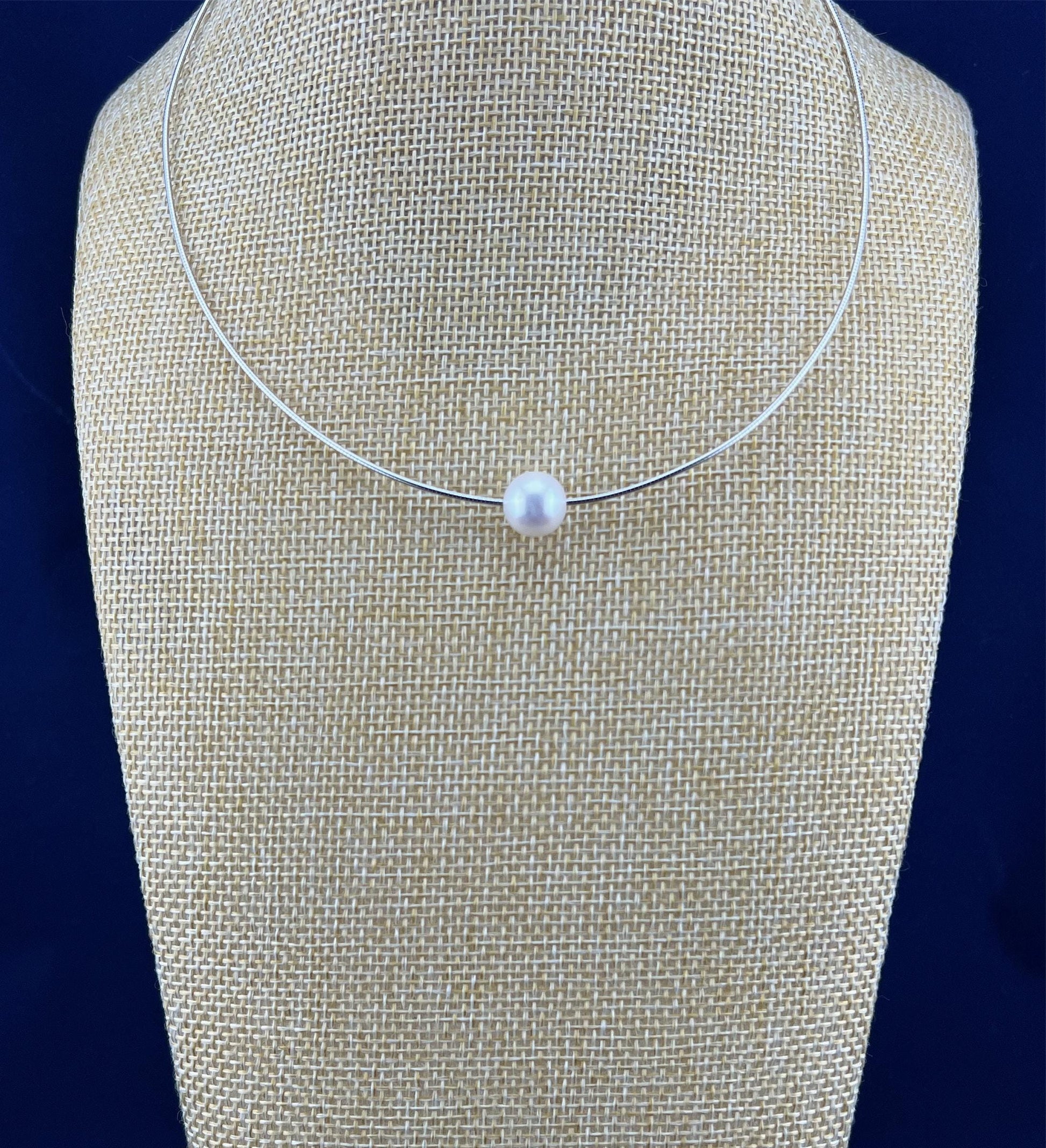 Discover the understated beauty of our Rhodium Plated Sterling Silver Wire Necklace featuring 9.5- 10 mm, Single White Cultured Freshwater Pearl. This minimalist pearl necklace offers a modern twist on classic elegance, creating the illusion of a floating pearl necklace that effortlessly enhances any outfit.