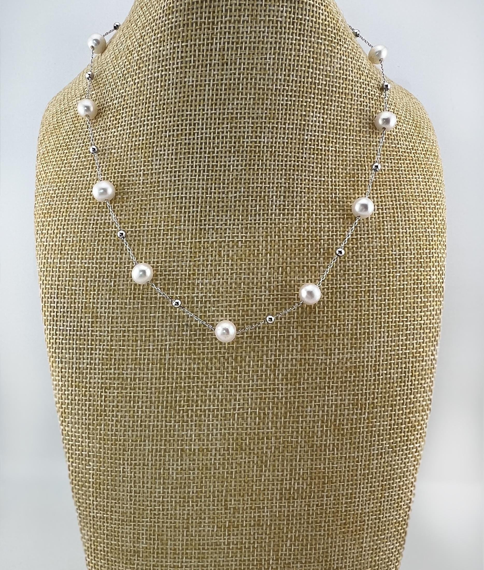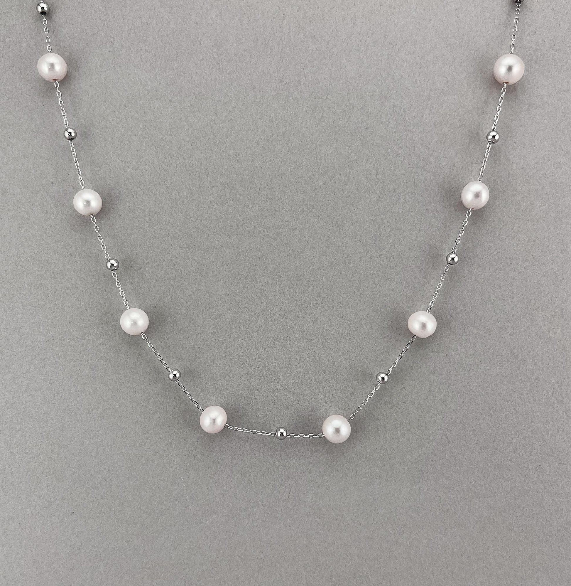 Pearls by the Yard Necklace – Cultured Freshwater Pearl Station Necklace in Rhodium Plated Sterling Silver- 16+2"