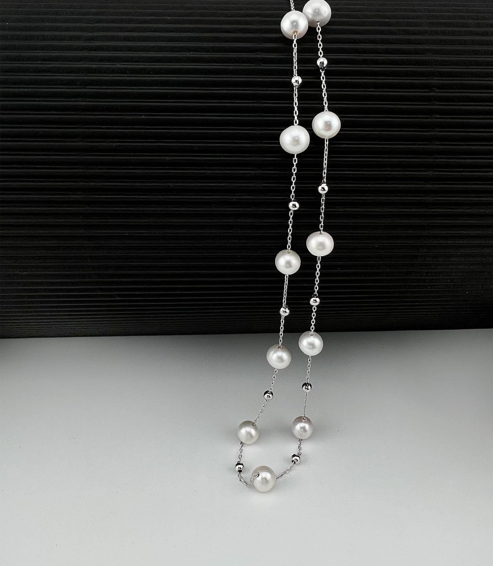To maintain the brilliance of your pearl station necklace, gently wipe it with a soft cloth after each wear. Avoid contact with harsh chemicals, perfumes, and lotions. Store in a jewelry box or pouch when not in use.