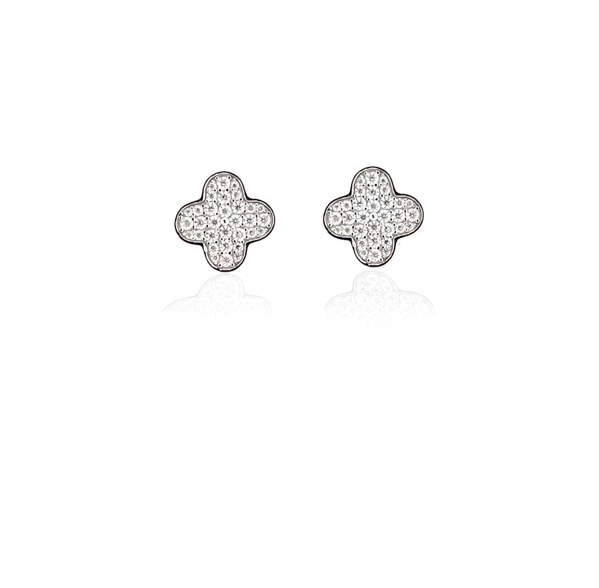 Moissanite Clover Stud Earrings: Rhodium Plated Sterling Silver Floral Earstuds