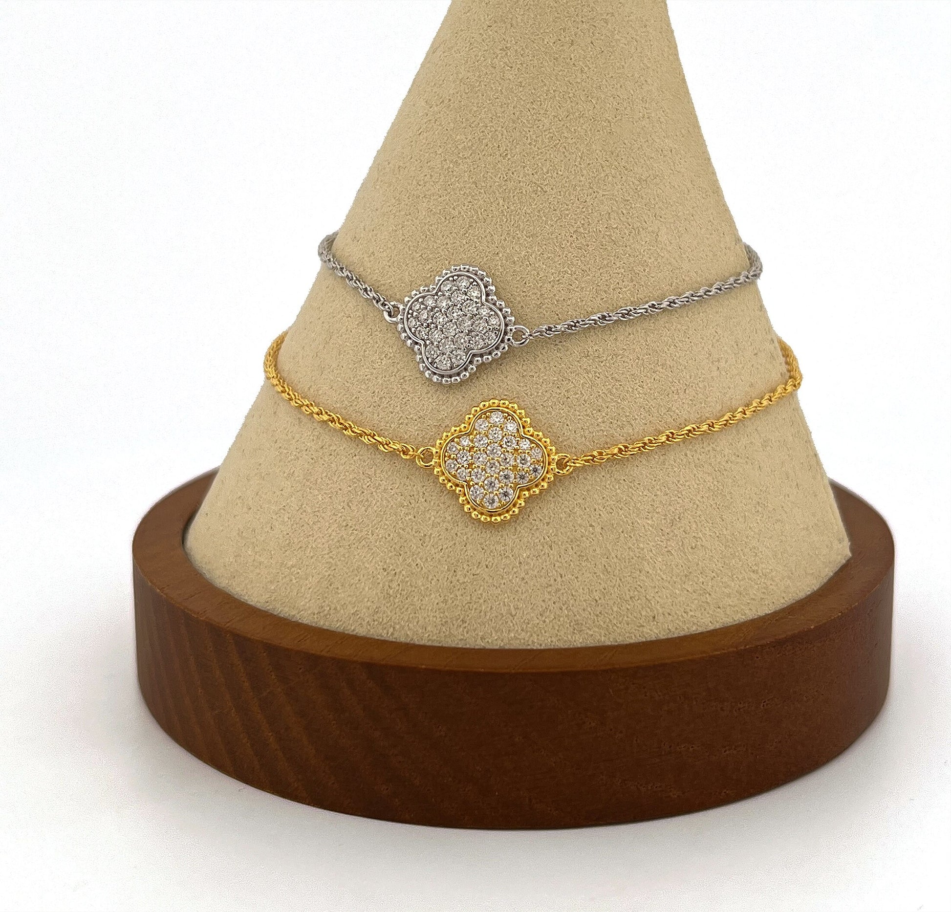Choose from 18k yellow gold or rhodium-plated sterling silver to match your personal style. The pavé setting adds a touch of glamour, making this bracelet a perfect accessory for any occasion. Whether you're celebrating a special moment or simply looking to add a touch of luck to your everyday life, this four-leaf clover bracelet is the perfect choice.