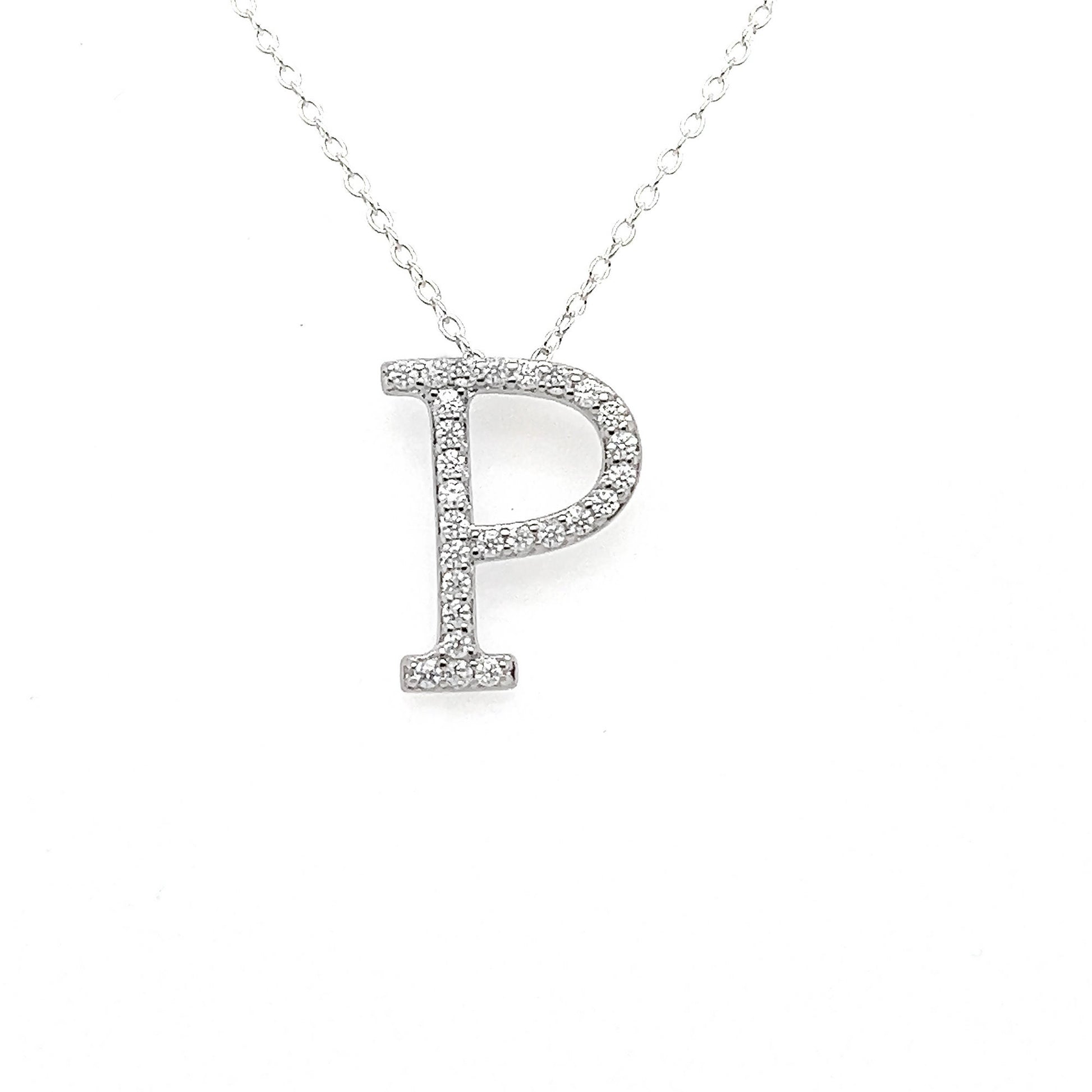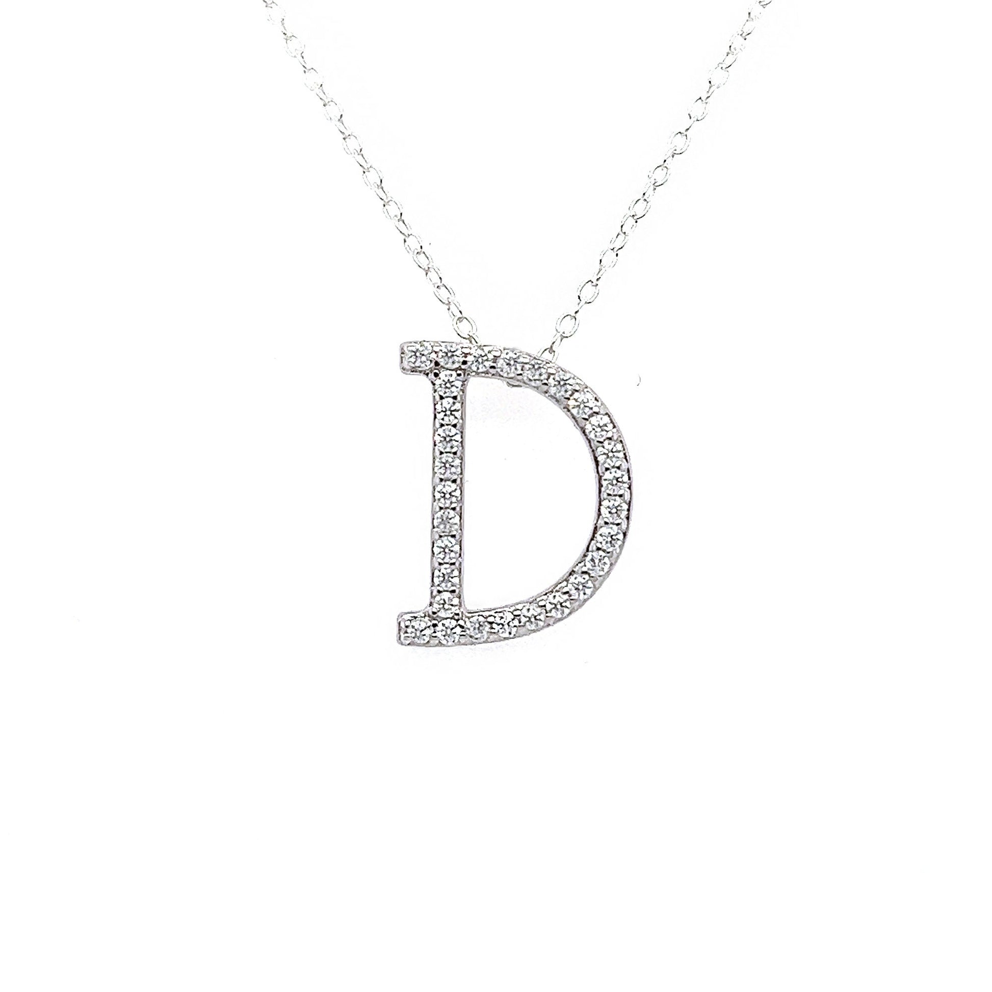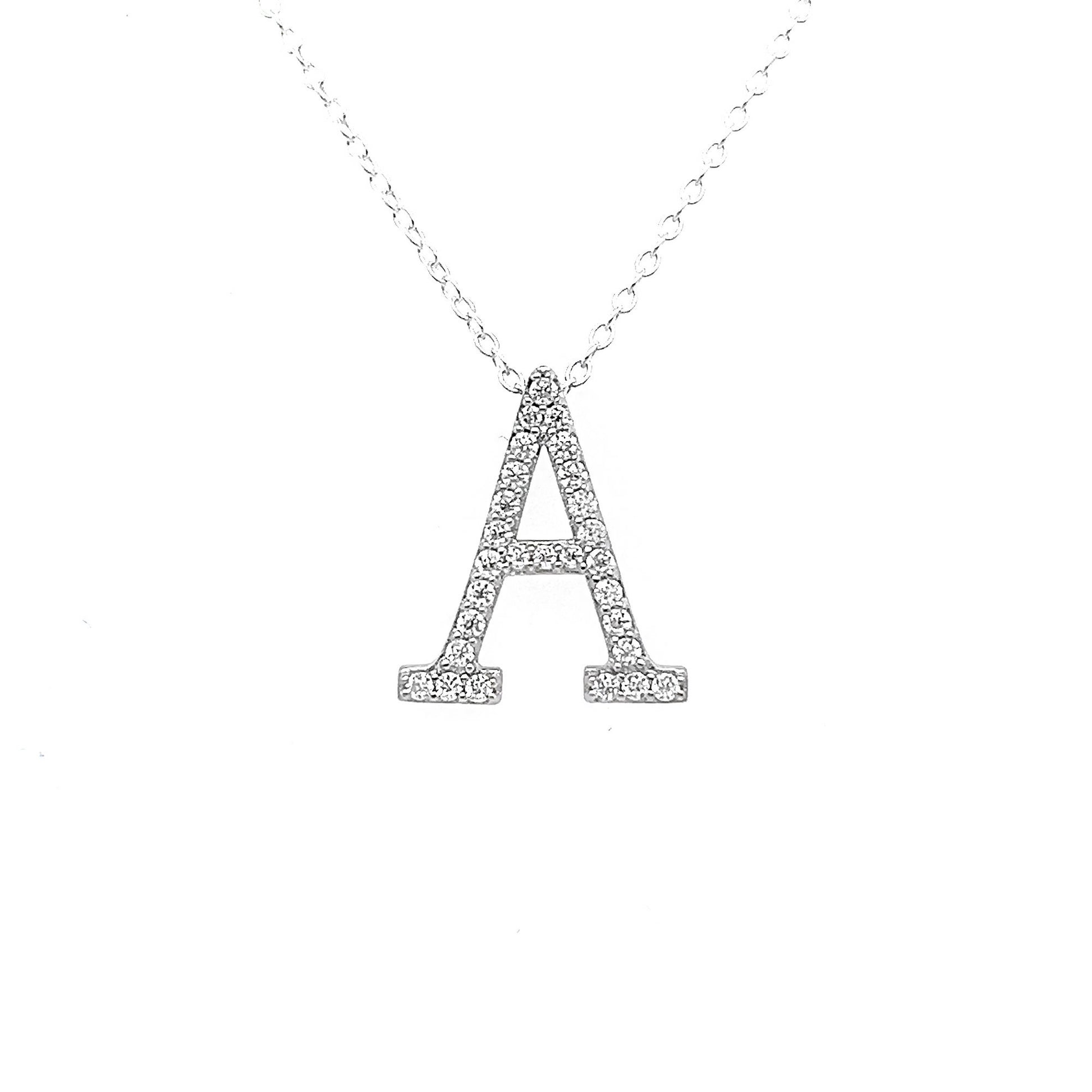 Moissanite Initial Necklace: Rhodium Plated Sterling Silver Letter Pendant