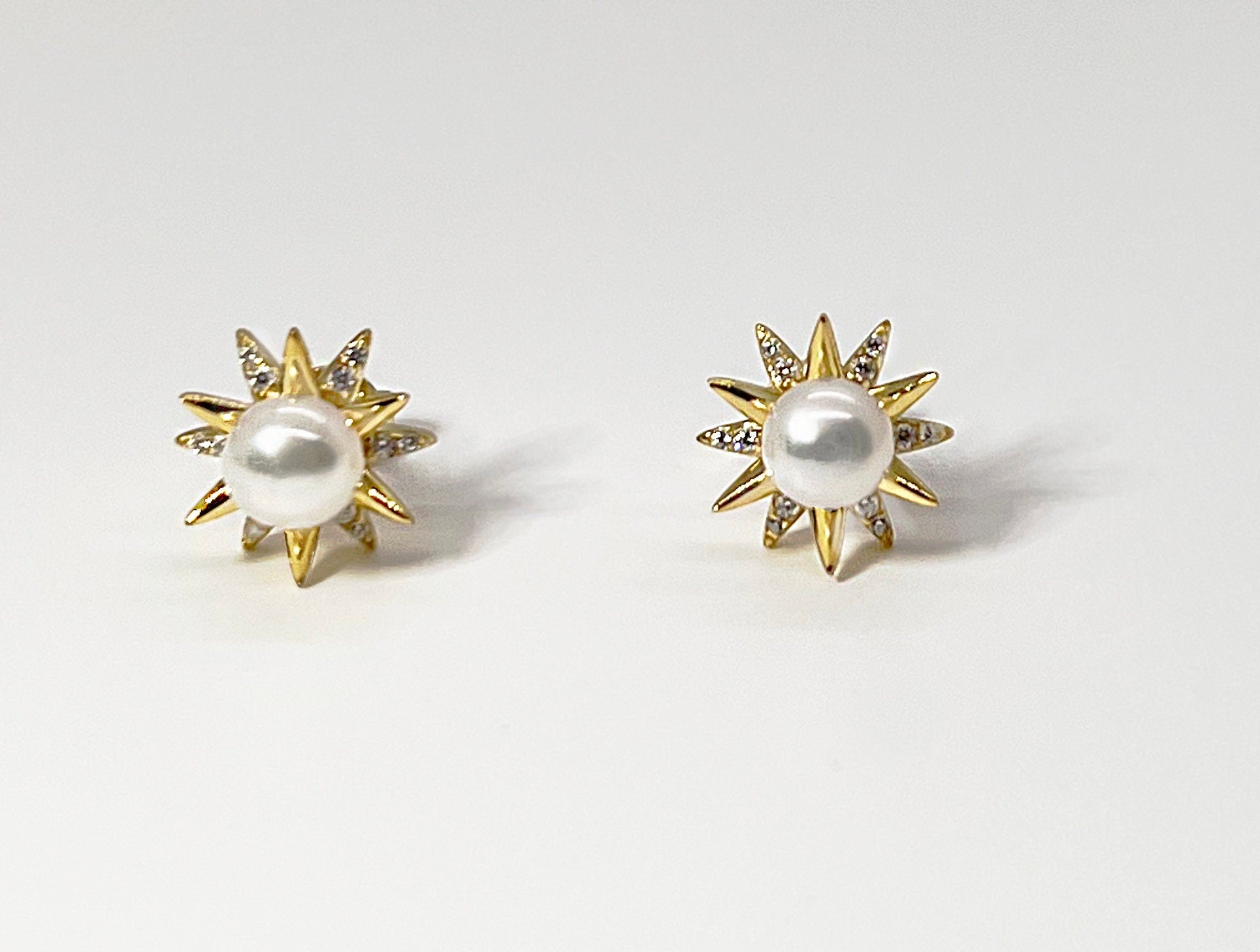 Pearl Star Stud Earrings: Yellow Gold Plated Sterling Silver, CZ
