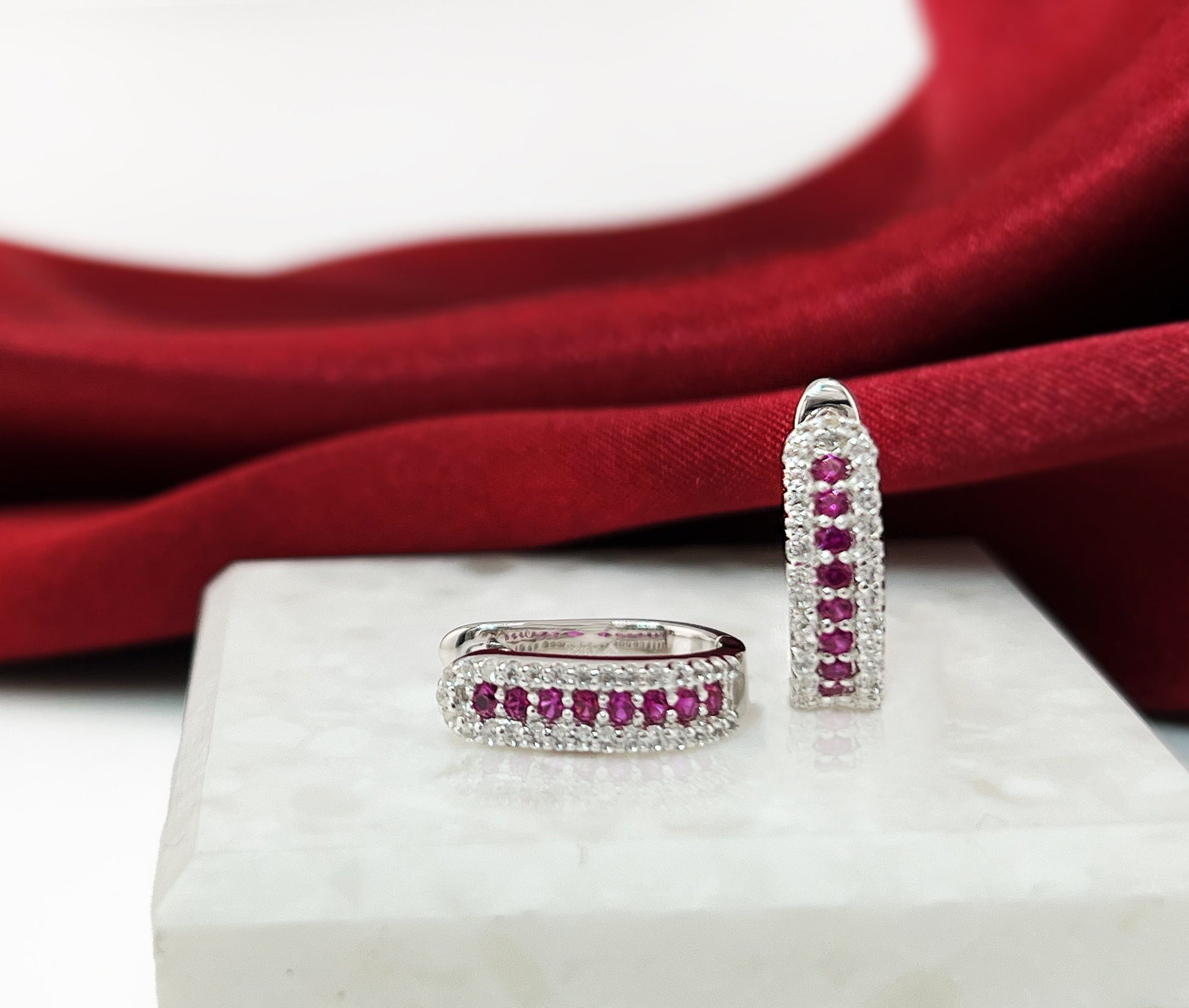 Ruby Huggie Earrings: Rhodium-Plated Sterling Silver, Small Hoop Earrings